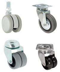 Les roulettes sont fabriqués avec des matériaux synthétiques non corrosifs et des roulements de haute qualité. Les roulettes à une roue ont une ligne pure et une finition impeccable, tandis que les roulettes à roues jumelées offrent un profil global et une charge nominale élevée.